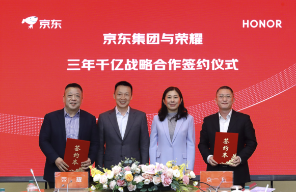 扫描或点击关注中金在线日,京东与荣耀签署战略合作协议,明确未来三年荣耀在京东全渠道实现销售额突破1000亿元的目标。根据协议,双方将基于各自优势,围绕产品共创、用户共营、生态共享三大维度,提升荣耀全品类销售规模,加快荣耀AI终端普及,开启用户全场景智能生活。同时,双方在深化零售、物流、科技、金融领域合作的基础上,也将进一步拓宽政企、工业、健康、保险、国际等领域合作边界,实现多产业深度融合与协同发展,探索更广阔的市场增长空间。 500)this.width=500 align=center hspace=10 vspace=10 rel=nofollow/ 在零售领域,京东与荣耀将针对手机、AIoT、机器人等多个品类,实现产品全生命周期共建,持续打造行业爆款,创新商业模式。产品共创层面,依托超级供应链,京东将助力荣耀全年旗舰新品首发,通过“先人一步”打造差异化专属权益与服务,实现新品即爆品。以全球首款机器人手机荣耀Robot Phone为例,其凭借创新形态与前瞻科技体验,一经亮相便备受行业与用户关注。未来,包括荣耀Robot Phone、人形机器人在内的创新品类、新产品将第一时间在京东开售。 500)this.width=500 align=center hspace=10 vspace=10 rel=nofollow/> 500)this.width=500 align=center hspace=10 vspace=10 rel=nofollow/
